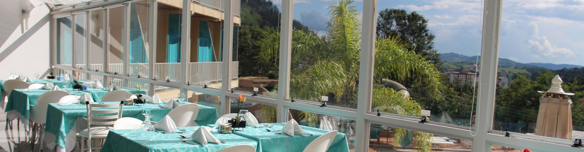 O restaurante do Hotel Zanon tem o privilégio de ser rodeado por uma paisagem única, cercada por montanhas e por um céu azul que só o Interior de SP tem.